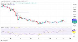 Between June and July SOLUSD has had a series of short-term rises and falls. It had its highest value at $42.4850 on the 6th of June. Then it had a series of swings; dropping to the lowest point of $28.535 on the 13th of June. As of today, the price holds at $41.535. A bearish candle stick on the 22nd of the month ended the uptrend indications of the 9-day moving average curve.